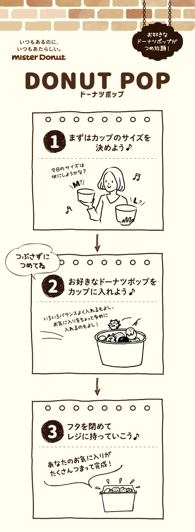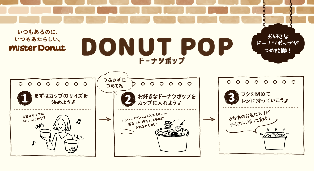 - ・時間帯や他商品の販売状況により、ドーナツポップ詰め放題を実施しない場合がございます。またドーナツポップ単品やセットでの販売の場合もございますのでドーナツポップ詰め放題の実施日時、内容などの詳細はショップへお問い合わせください。