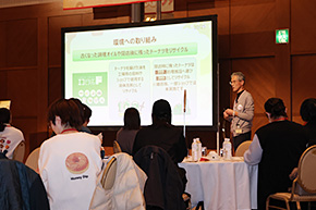 - ・「スクラッチカードを復活させて欲しい」、「 グレーズのついていないドーナツの種類を増やして欲しい 」「 ネットオーダーでクーポンを使えるようにして欲しい 」といった要望に、取締役COOの和田及びミスタードーナツ事業本部の担当者や、地域の加盟店代表らが回答を行いました。また、大分県にちなんだクイズでは多くの方から手が挙がり急遽全員参加型になるなど会場が一体となって楽しんでいただくことができました。